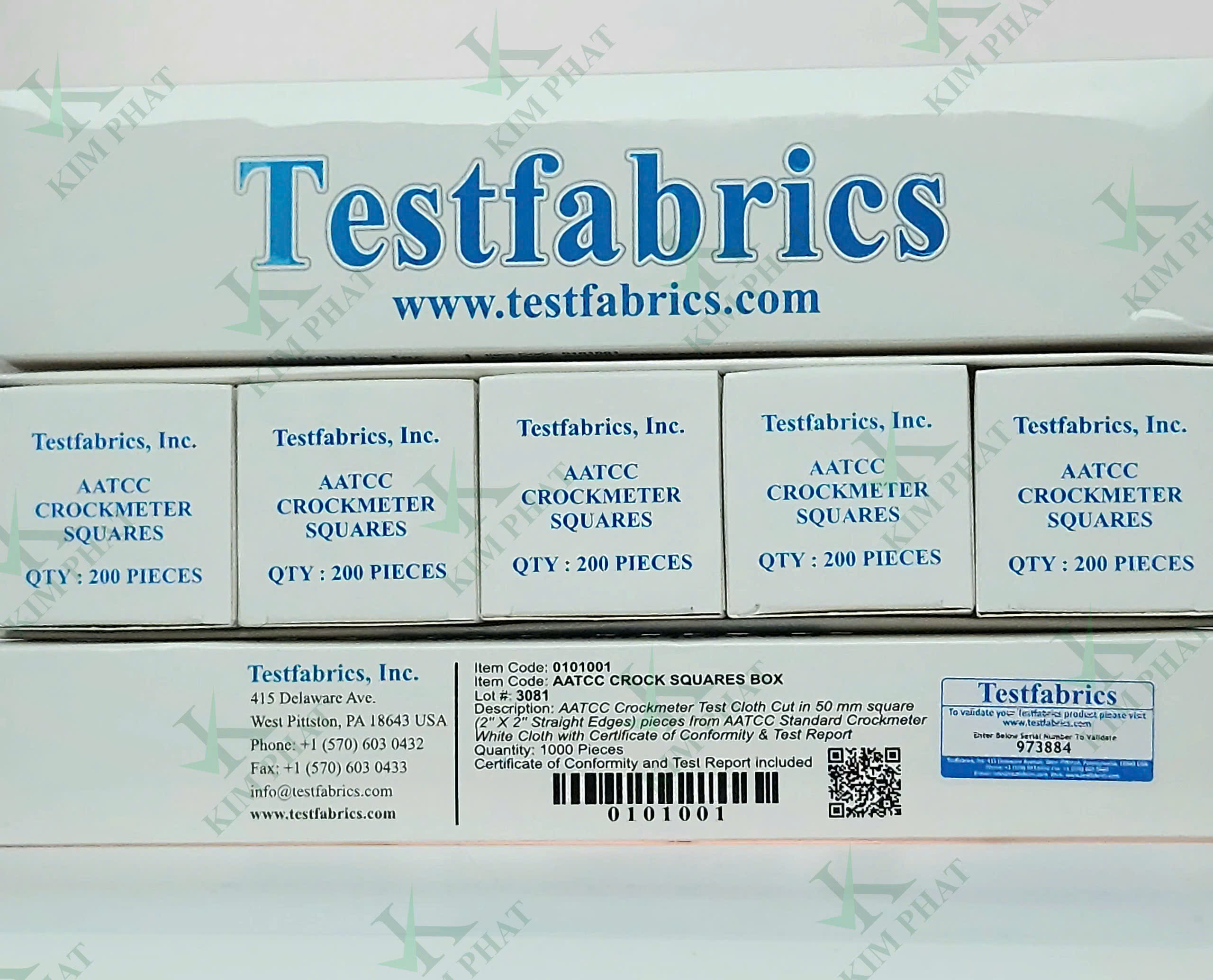 Công ty TNHH Khoa học Kỹ thuật Kim Phát là đại diện phân phối các sản phẩm vải thử nghiệm của các hãng nổi tiếng như Testfabrics, JSA, James Heal, SDC... Ngoài ra, Công ty còn phân phối hóa chất tinh khiết của các hãng như Merck, VWR, Fisher, Trung Quốc ... và dụng cụ thí nghiệm của các hãng Duran, Isolab, Vitlab, Trung Quốc...