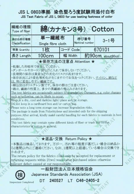 Vải thử nghiệm JIS Cotton, dùng kiểm tra độ bền màu của vải theo tiêu chuẩn JIS L 0803